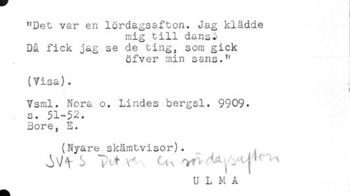 //// "Det var en lördagsafton. Jag klädde //// mig till dans^ //// Då fick jag se de ting, som gick //// öfver min sans." i //// < //// (Visa). //// '' *' //// Vsml. Nora o. Lindes bergsl. 9909. //// . s. 51-52. //// Bore, E. //// (Nyare skämtvisor). //// U L M A ////