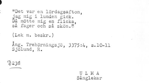 //// ; "Det var en lördagsafton, //// jag mig i lunden gick. //// Då mötte mig en flicka, //// så fager och så skön.C. //// (Lek m. beskr.) //// * //// Ång. Trehörningsjö, 3375:4, s.10-11 //// Sjölund, R. //// <3)238 //// U L M A //// Sånglekar ////