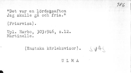 //// "Det var en lördagsafton //// Jag skulle gå och fria." //// (Friarvisa). //// Upl. Harbo, 303:946, s.12. //// Martinelle. //// (Enstaka kärleksvisor). //// i //// U L M A //// t ////