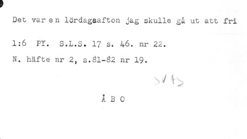 //// Det var e n lördagsafton jag skulle gå ut att fri //// 1:6 PY. S.L.S. 17 s. 46. nr 22. //// N. häfte nr 2, s.81-82 nr 19. //// ÅBO //// k ////