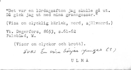 //// "Det var en lördagsafton jag skulle gå ut. //// Då gick jag ut med mina granngossar.t' //// (Visa om olycklig kårlek, mord, självmord.) //// j* //// Vb. Degerfors, 8653, s.61-62 //// Palmblad, W. //// (Visor om olyckor och brott). //// U L M A ////