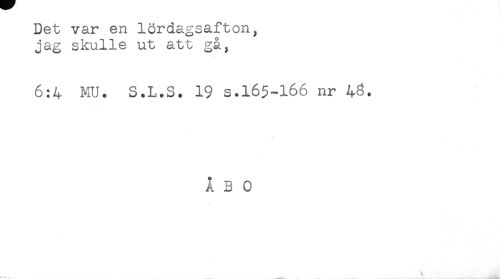 //// Det var en lördagsafton, //// jag skulle ut att gå, //// 6:4 MU. S.L.S. 19 s.165-166 nr 4^. //// A B 0 //// t ^ ////