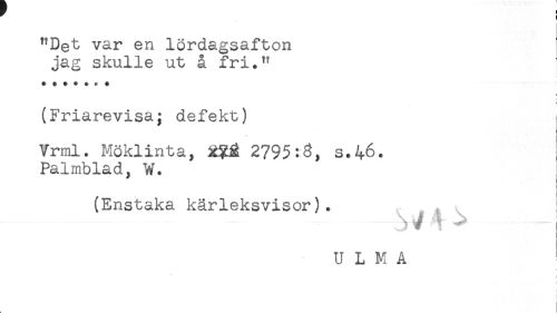//// ! //// "Det var en lördagsafton //// jag skulle ut å fri." //// (Friarevisa; defekt) i //// . //// * //// Vrml. Möklinta, ^ 2795:3, s.46. //// Palmblad, W. //// t //// (Enstaka kärleksvisor). < , //// U L M A ////