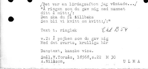 //// /ueu var en vcmu^u.^... //// /"A ringen som du gav mig med namnet //// ditt å mitt:/: //// ^ Den ska du få tillbaka //// ^ Sen bli vi kvitt om kvitt:/:" //// R //// Text t* ringlek ^ ^ //// v. 2: A pojken som du gav mig //// Med det svarta, krulliga hår //// Danstext, kanske visa. //// Smål.V.Torsås, 13563,s.22 M 30 //// A.NiUson, ULM A //// t. ////