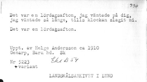 //// Det var en lördagsafton, jag väntade på dig, //// jag väntade så länge, tills klockan slagit ni. //// < //// < //// i //// Det var en lördagsafton. //// < //// l //// Uppt. av Helge Andersson ca 1910 //// Genarp, Bara hd. Sk //// Nr 5223 ^ //// variant //// LANDSMÅLSA^IVET I LUND ////