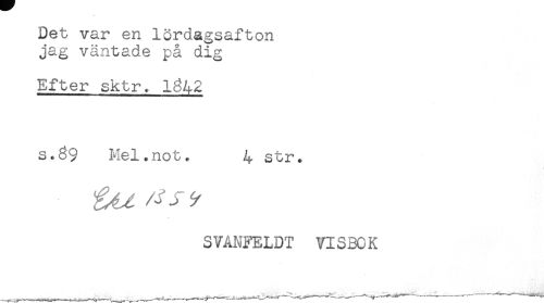 //// Det var en lördagsafton //// jag väntade på dig //// Efter sktr. 1342 //// S.39 Mel..not. 4 str. //// SVANFELDT VISBOK ////