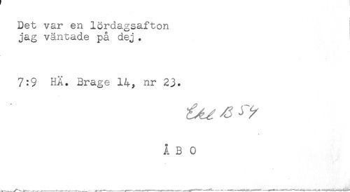 //// Det var en lördagsafton //// jag väntade på dej. //// 7:9 HÄ. Brage 14, nr 23. //// « ^ - X ////