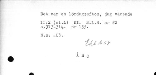 //// - . - . //// - . . . - ... . . //// f //// Det var en lördagsafton, jag väntade //// 11:2 (el.4) Kl. S.L.S. nr 82 //// s.313-314. nr 155. //// N.s. 406. //// ^ A B o ////