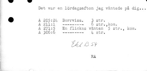 //// Det var en lördagsafton jag väntade på dig... //// j ^ A 205:24 Borrvisa. 3 str. //// A 211:1 ---- 6 str.,kom. //// t A 271:5 En flickas väntan $ str., kom. //// A 306:6 ---- 4 str. //// ^. //// RA ////