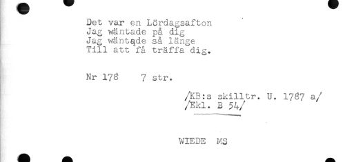//// Det var en Lördagsafton //// Jag wäntade på dig //// Jag wäntqde så länge //// Till att få träffa dig. //// Nr 173 7 str. //// /KB:s skilltr. U. 1787 a //// //Ekl. B 54 //// /WIEDE I4S ////