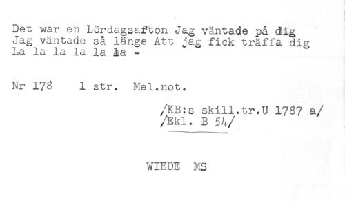 //// Det war en Lördagsafton Jag väntade på dig //// Jag väntade så länge Att jag fick träffa dig //// La la la la la ia - //// Nr 17^ 1 str. Mel.not. //// /KB:s skill.tr.U 1737 a //// //Ekl. B 54 //// /* //// WIEDE MS ////