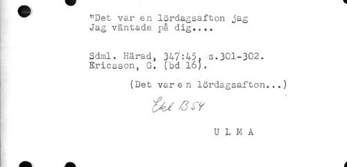 //// ^ ^-Det var en lördagsafton jag //// Jag väntade på dig.... //// Sdml. Härad, 347:45, s.301-302. //// Ericsson, G. (bd l6j. //// (Det våren lördagsafton...) ////
