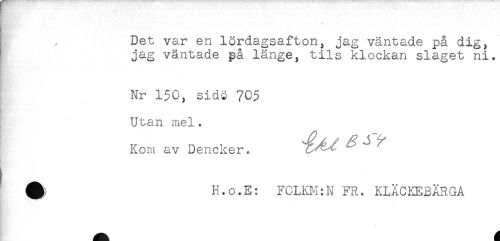 //// t; //// [ , Det var en lördagsafton, jag väntade på dig, //// jag väntade på länge, tils klockan slaget ni. //// Nr 150, sido 705 //// Utan mel. //// Kom av Dencker. //// ^ ^ H.o.E: F0LKM:N FR. KLACKEBARGA //// //// /