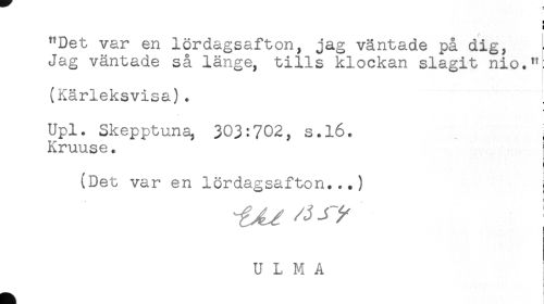 //// ) //// i //// "Det var en lördagsafton, jag väntade på dig, //// Jag väntade så länge, tills klockan slagit nio." //// (Kärleksvisa). //// Upl. Skepptuna, 303:702, s.l6. //// Kruuse. //// (Det var en lördagsafton...) I ////