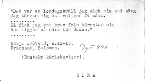 //// "Det var en lördagskväll jag gick mig uti säng //// Jag tänkte mig att roligen få såva. //// ********* //// Då fick jag ett brev från kärestan min , //// Hon ligger så nära för döden." //// ^ ^ A ^ ^ //// Härj. 17679:3, s.12-15. , , //// Ericsson, Salomon. //// (Enstaka kärleksvisor). //// ? //// U L M A ! //// r //// - ////