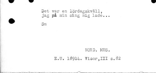 //// Det var en lördagskväll, //// jag på min säng mig lade... //// ^ Sm //// ! //// i //// ^ -- //// I. //// NORD. MUS. //// E.U. 18914. Visor,III s.82 ////
