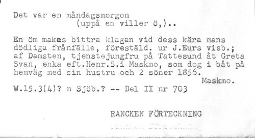 //// Det var en måndagsmorgon //// (uppå en viller Ö,)*. //// En öm makas bittra klagan vid dess kära mans //// dödliga frånfälle, förestäld. ur J.Eurs visb.; //// af Damsten, tjenstejungfru på Tattesund åt Greta //// Svan, enka eft.Henr.S.i Maskmo, som dog i båt på //// hemväg med sin hustru och 2 söner 18$6* //// Maskmo. //// W.15.3(4)? n Sjöb.? -- Del II nr 703 //// RANCKEN FÖRTECKNING ////