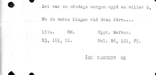 //// Det var en måndags morgon uppå en viller 0, //// En Om makas klagan vid dess käre..., //// 15:4. MM. Uppt. Wefvar. //// R3, 165, 12. Mel. R6, 191, 35. //// ÅBO RANCKEN MS ////