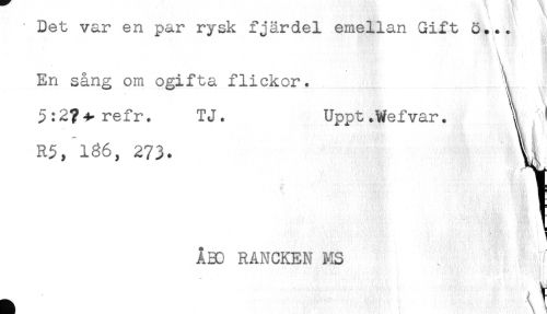 //// ' Det var en par rysk fjärdel emellan Gift ö... //// - i //// En sång om ogifta flickor. \ //// 5:2?^ refr. TJ. Uppt.Wefvar. S ^ ) //// 1 //// ÅBO RANCKEN MS . f //// ^ . \ ////