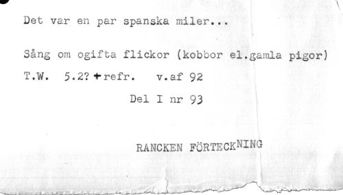 //// Det var en par spanska miler... //// Sång om ogifta flickor (kobbor el.gamla pigor) //// T.W. 5.27 1-refr. v.af 92 //// Del I nr 93 //// RANCKEN FÖRTECKNING ////