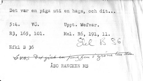 //// Det var en piga uti en hage, och dit... //// 5:4. Vö. Uppt. Wefvar. //// < - n ^ H //// R3, 165, 101. Mel. R6, 191, 11. //// Efkl B 36 ^ - //// ÅBO RANCKEN MS ////