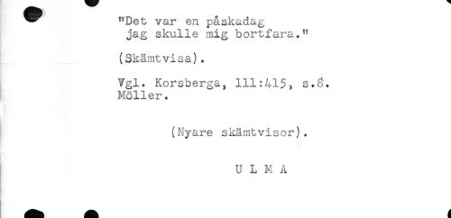 //// ^^ "Det var en påskadag //// jag skulle mig bortfara." //// (Skämtvisa). //// Vgl. Korsberga, 111:415, //// Möller. //// (Nyare skämtvisor). //// U L M A ////