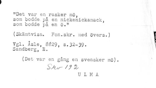 //// "Det var en rasker mö, //// som bodde, på en nickenickanack, //// som bodde på en o." //// (Skämtvisa. Fon.skr. med övers.) ! //// Vgl. Åsle, 3329, s.32-39. ! //// Sandberg, B. //// (Det var en gång en svensker mö). ////