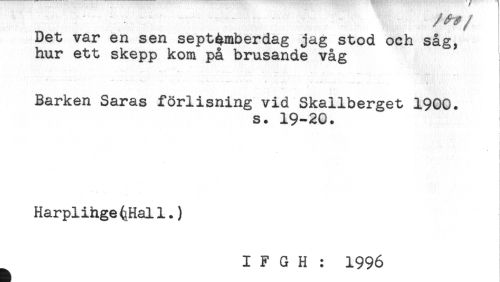 //// Det var en sen septemberdag jag stod och såg, //// hur ett skepp kom på brusande våg //// — --' *. . .. . . //// Barken Saras förlisning vid Skallberget 1900. //// s. 19-20. //// Harplihge^Hall.) //// I F G H : 1996 ////