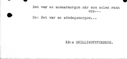 //// Det var en sommarmorgon när som solen rann //// opp... //// ^ Se: Det var en söndagsmorgon... //// ! . - //// . //// KB:s SKILLINGTRYCKSREG. //// P ////
