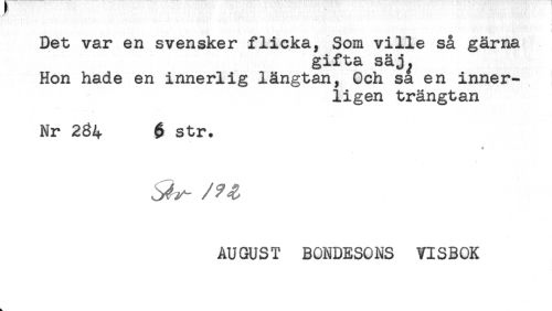 //// Det var en svensker flicka, Som ville så gärna //// gifta säj^ //// Hon hade en innerlig längtan, Och sa en inner- //// ligen trängtan //// Nr 234 $ str. //// AUGUST BONDESONS VISBOK ////