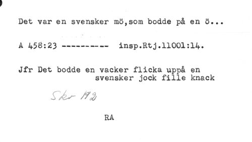 //// Det var en svensker mö,som bodde på en ö... //// A 458:23 ----- insp.Rtj.11001:14* //// Jfr Det bodde en vacker flicka uppå en //// svensker jock fille knack //// RA ////