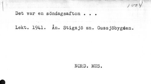 //// , / en? y //// Det var en söndagsafton . . . //// : //// Lekt. 1941. Ån. StigsjÖ sn. Gussjöbygden. //// NORD. MUS. ////