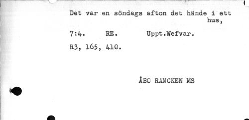 //// Det var en söndags afton det hände i ett //// hus, //// - //// 7:4. RE. Uppt.Wefvar. //// R3, 165, 410. //// ÅBC RANCKEN MS //// ; ////
