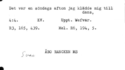 //// < //// Det var en söndags afton jag klädde mig till //// dans, //// 4:4* KV. Uppt. Wefvar. //// R3, 165, 439. Mel. R6, 194, 5. //// ^ ÅBO RANCKEN MS ////