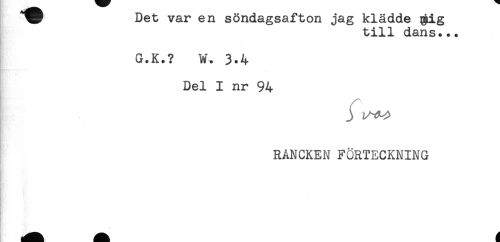 //// ^^ Det var en söndagsafton jag klädde $ig //// till dans... //// G.K.? W. 3.4 //// Del I nr 94 //// i i^) //// RANCKEN FÖRTECKNING //// } ////