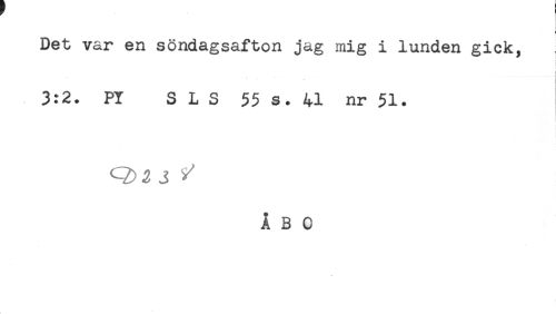 //// ! //// Det var en söndagsafton jag mig i lunden gick, //// ) //// < //// 3:2. PY S L S 55 s. 41 nr 51. //// ÅBO ////