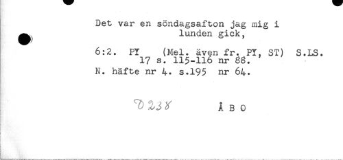 //// Det var en söndagsafton jag mig i //// ^ lunden gick, //// 6:2. PY (Mel. även fr. PY, ST) S.LS. //// 17 s. 115-116 nr //// N. häfte nr s.195 nr 64. //// ^ ^ ÅBO //// ! //// t ////