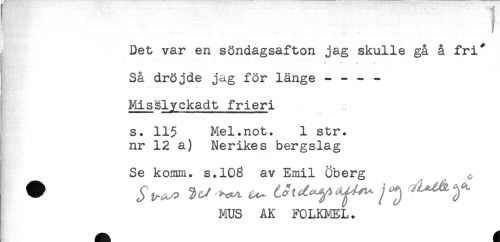 //// ' ' .. .... . -... \ . ^ .. .. //// Det var en söndagsafton jag skulle gå å fri* //// V * ; ? //// Så dröjde jag för länge - - - - //// By*'. - '...- - .- — -t , .. . //// Misälyckadt frieri //// * //// s. 115 Mel.not. 1 str. //// nr 12 a) Nerikes bergslag //// Se komm. s.108 av Emil Öberg ^ //// MUS AK FOLKMEL. ////