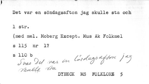 //// Det var en söndagsafton jag skulle sta och //// 1 str. //// (med mel. Moberg Except. Mus Ak Folkmel //// s 115 nr 1? //// DYBECK MS FOLKLORE 5 ////