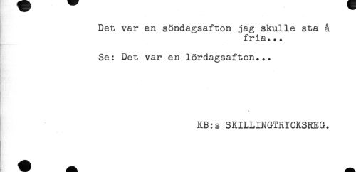 //// Det var en söndagsafton jag skulle sta å //// fria... //// Se: Det var en lördagsafton... //// * //// KB:s SKILLINGTRYCKSREG. ////