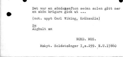 //// Det var en söndagsafton sedan solen gått ner //// ^ en skön krigare gick ut ... //// (not. uppt Carl Viking, Kråksmåla) //// ( //// Sm //// Alghult sn //// } //// NORD. MUS. //// Mskpt. Soldatsånger I,s.259. E.U.17^60 ////