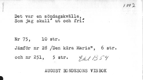 //// § ' //// < //// Det var en söndagskvälle, //// Som jag skull* ut och frif ! //// i //// Nr 75, 10 str. //// Jämför nr 28 /Den kära Maria", 6 str. //// och nr 251, 5 str. ^ //// * //// = //// AUGUST BONDESONS VISBOK //// < //// - ////