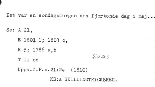 //// Det var en söndagsmorgon den fjortonde dag i maj... //// Se: A 21, //// E 1301 1; 1303 c, //// R 1786 a,b //// rn //// T 11 oo //// Upps.Z.P.s.21:24 (1810) //// KB:s SKILLINGTRYCKSREG. ////