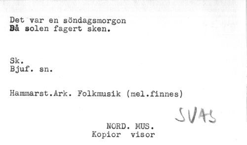//// Det var en söndagsmorgon //// Bå solen fagert sken. //// Sk. //// Bjuf. sn. //// i //// t //// Hammarst.Ark. Folkmusik (mel.finnes) //// NORD. MUS. //// Kopior visor ////