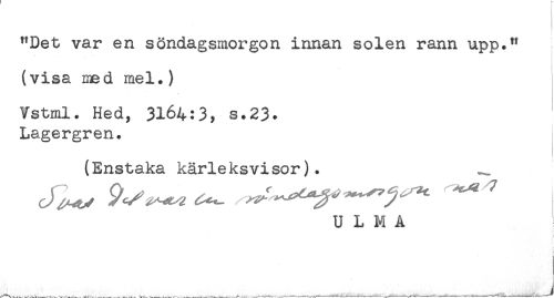 //// "Det var en söndagsmorgon innan solen rann upp." //// (visa med mel.) //// Vstml. Hed, 3164:3, s.23. //// Lagergren. //// (Enstaka kärleksvisor). ^ //// U L M A //// { ////