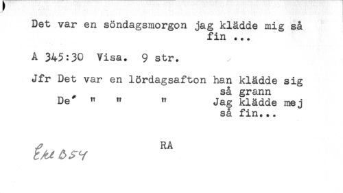 //// Det var en söndagsmorgon jag klädde mig så //// fin ... //// A 345:30 Visa. 9 str. //// Jfr Det var en lördagsafton han klädde sig //// så grann //// De " " " Jag klådde mej //// så fin... //// RA //// - ////