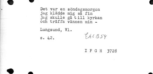 //// Det var en söndagsmorgon //// jag klådde mig så fin //// jag skulle gå t ill kyrkan //// och träffa vännen min - //// Lungsund, VI. //// s. 42. //// I F G H 372g ////