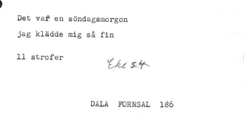 //// Det vaf en söndagsmorgon //// jag klädde mig så fin //// 11 strofer , //// DALA FORNSAL 186 //// * ////