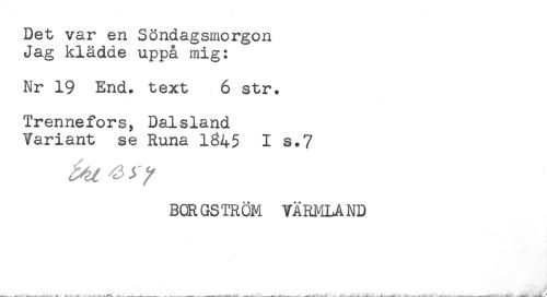 //// Det var en Söndagsmorgon //// Jag klädde uppå mig: //// Nr 19 End. text 6 str. //// Trennefors, Dalsland //// Variant se Runa 1345 I s.7 //// BOR GS TR ÖM VÄRMLA ND //// ____ ., ..... , .. . . ___,—___. .. ___ __ ... _ - . - ^ . ... - ___ . .. <.. .. .. __ —___ ... , — ////