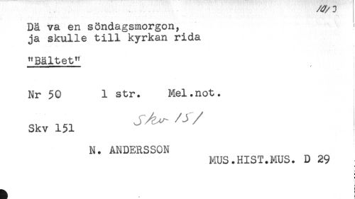 //// ^ ....... . ^ ^ //// Dä va en söndagsmorgon, //// ja skulle till kyrkan rida //// "Bältet" //// ... //// Nr 50 1 str. Mel.not. //// - //// C, T KT ^^ ^ //// /Skv 151 //// N. ANDERSSON //// MUS.HIST.MUS. D 29 //// ! //// ! ////